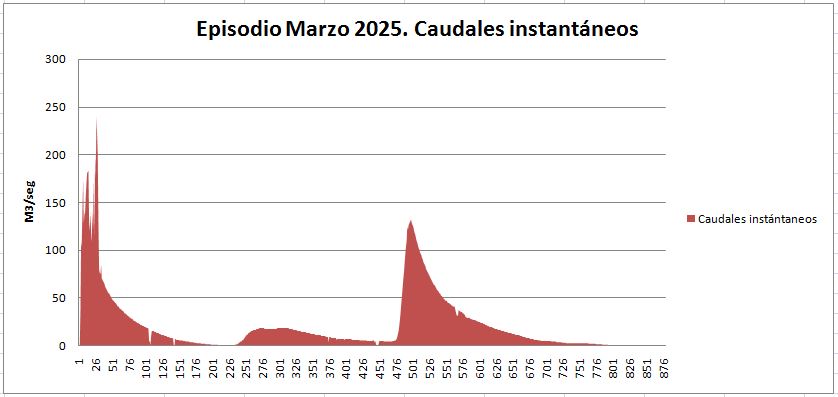 Comenzamos el mes de Marzo de 2025 con importantes precipitaciones, tanto en la parte alta de la cuenca como en la baja. Como consecuencia, se produce un importante incremento de los caudales del río ocasionando una avenida ordinaria. La punta de la crecida llega a Mazaleón la noche del día 4. A partir de ese momento los caudales comienzan a remitir hasta el día 9 de Marzo cuando se produce un repunte de caudal, llegando nuevamente a sobrepasar los 100 m3/seg. A partir de ese momento, el caudal se va reduciendo hasta alcanzar el caundal nominal para la época del año en que estamos. En total se han vertido al ebro aproximadamente 17 hm3, agua suficiente para llenar casi al 100% el único pantano que regula la cuenca. El agua que se ha podido retener ha sido mínima, aunque gracias al túnel del trasvase Matarraña-Pena (ya está en funcionamiento después de las obras de reparación) se ha conseguido aumentar el agua embalsada.
