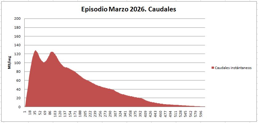 Después de un Enero y Febrero excepcionales en días de lluvia y precipitación acumulada, arrancamos el mes de marzo con un nuevo temporal de levante de primera categoría. El episodio se concentra entre los días 5 y 7 de marzo ambos inclusive. Como consecuencia del temporal se genera una avenida ordinaria, alcanzando los 120m3/seg en dos puntas. En cuanto al volumen total aportado, es significativamente alto para una riada de estas características. Debido a la acumulación de lluvias de los meses anteriores, el nivel de recarga de los acuíferos está prácticamente al 100% y al recibir más aportaciones comienzan a descargar de forma inmediata. Como consecuencia, se genera más caudal punta y el descenso se prolonga más en el tiempo, aportando gran cantidad de m3.
